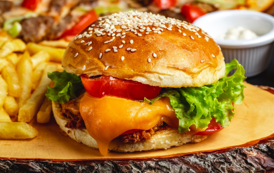 Pollo crujiente, queso, lechuga, tomate, cebolla